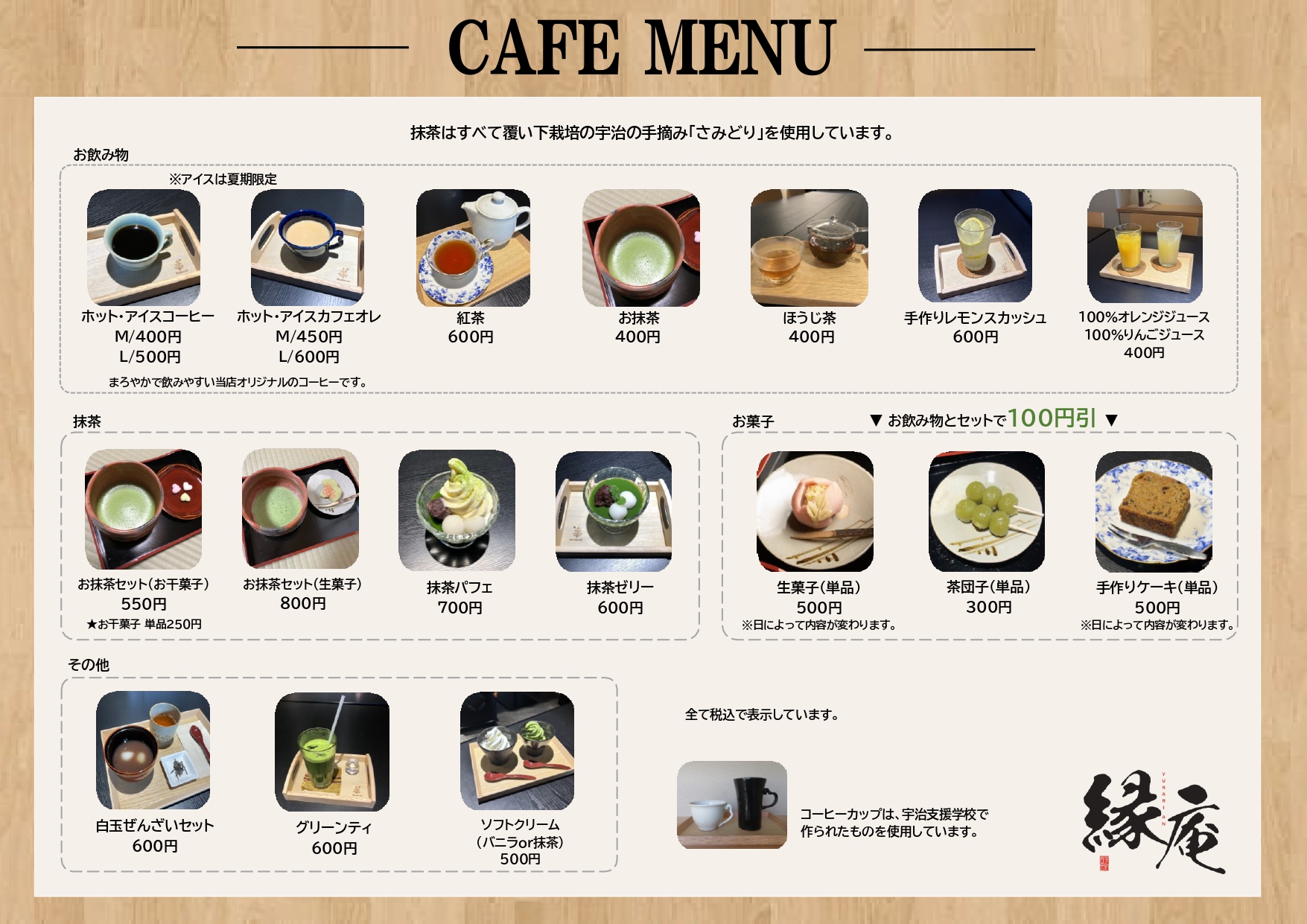カフェからのお知らせ 2026.04.23 縁庵まつり マルシェ店舗紹介【縁庵カフェ】【宇治吉田運送ゲームコーナー】 2026.04.22 縁庵まつり マルシェ店舗紹介【sousakumama】 2026.04.21 縁庵まつり マルシェ店舗紹介【kohasyuge & ami】 一覧ページへ >